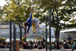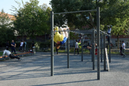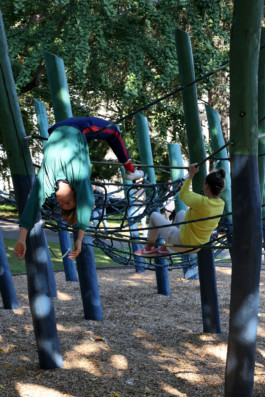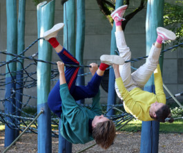 Experiment 2: Kann ein Spielplatz auch wie ein Trapez sein? 10 Minuten Improvisation. Ein Spielplatz als Experimentierfeld um das Bewegungsvokabular vom Trapez auf die gegebenen Objekte und Situationen zu übertragen und mit den Möglichkeiten zu spielen.